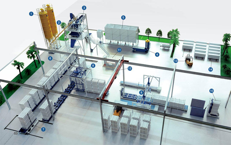 立式復(fù)合輕質(zhì)墻板生產(chǎn)線為閉環(huán)式生產(chǎn)線,采用全自動(dòng)配料、連續(xù)自動(dòng)攪拌技術(shù)、自動(dòng)模車(chē)移動(dòng)、模具翻轉(zhuǎn)自動(dòng)脫模、數(shù)字化管理系統(tǒng)等來(lái)獲得外形完好和精確度高的制品。 特點(diǎn) (1)在制品生產(chǎn)過(guò)程中,該模式相對(duì)其他模式的生產(chǎn)方式占地面積最小。 (2)注料能夠快速將模腔住滿(mǎn)且容易搗實(shí)又不易形成空鼓,因此可以獲得很高的成品率。 (3)該生產(chǎn)線只需通過(guò)增加模具量即可擴(kuò)大生產(chǎn)量。 |