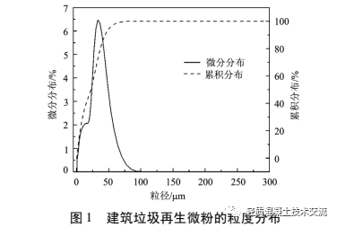 式破碎機(jī)破碎, 過(guò) 200 目方孔篩得到建筑垃圾再生微粉, 篩余量小于 5% 。建筑垃圾再生微粉的粒度分布和 XRD 圖譜分析如圖 1、2 所示。由圖譜分析