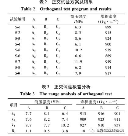 2) 若是以筒壓強(qiáng)度較大值作為考查指標(biāo)來(lái)確定物料配合比, 此時(shí)物料的最優(yōu)水平組合方案為A3B2C3, 此方案在正交試驗(yàn)中并未出現(xiàn), 但從此方案組合配合比中可以看出, 建筑垃圾的利用率較高,能夠達(dá)到 26. 3% , 但是水泥的使用量占到物料配合比 21. 1% , 水泥消耗量較大, 同時(shí)會(huì)增加陶粒的密度, 所以此方案不能作為最優(yōu)水平組合。若是以最小筒 壓 強(qiáng) 度 作 為 組 合 方 案, 此 時(shí) 的 組 合 方 案 為A2B3C1, 此方案是正交試驗(yàn)組 S-6, 建筑垃圾的利用率為 23. 5% , 而 且 水 泥 的 消 耗 量 只 占 物 料 的11. 8% , 此時(shí)陶粒的筒壓強(qiáng)度為 6. 6 MPa, 已經(jīng)達(dá)到了高強(qiáng)人造輕集料最低標(biāo)準(zhǔn)值 6. 5 MPa 。