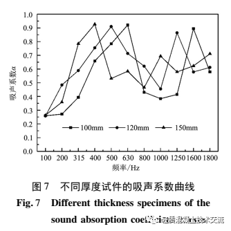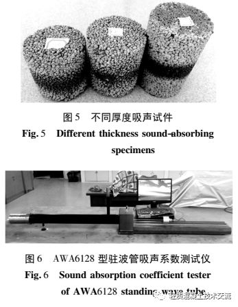 本文以建筑垃圾陶粒為骨料制成的多孔水泥基陶粒吸聲降噪材料, 其抗折強(qiáng)度為 2. 5 ~ 3. 3 MPa、抗壓強(qiáng)度為 10 ~ 12 MPa, 能夠滿足水泥基陶粒吸聲材料抗折強(qiáng)度大于 2 MPa、抗壓強(qiáng)度大于 8 MPa 的力學(xué)性能要求。經(jīng)過(guò)試驗(yàn)得到地鐵軌道交通吸聲降噪材料的配合比為: 粒徑范圍為 1 ~ 8 mm 陶粒為60% ~ 65% 、水泥為 30% ~ 35% 、水灰比為 0. 24 ~0. 28、外加劑為 0. 5% ~ 1. 5% 。將各材料組分進(jìn)行混合拌制, 制作出直徑為 96 mm, 高度分別為 100mm、120 mm、150 mm 的圓柱體吸聲試件, 如圖 5 所示。采用杭州愛(ài)華 AWA6128 型駐波管吸聲系數(shù)測(cè)試儀進(jìn)行材料吸聲系數(shù)測(cè)試, 測(cè)試儀如圖 6 所示。采用聲學(xué)駐波管法測(cè)試出陶粒吸聲材料的吸聲系數(shù)曲線, 如圖 7 所示 。